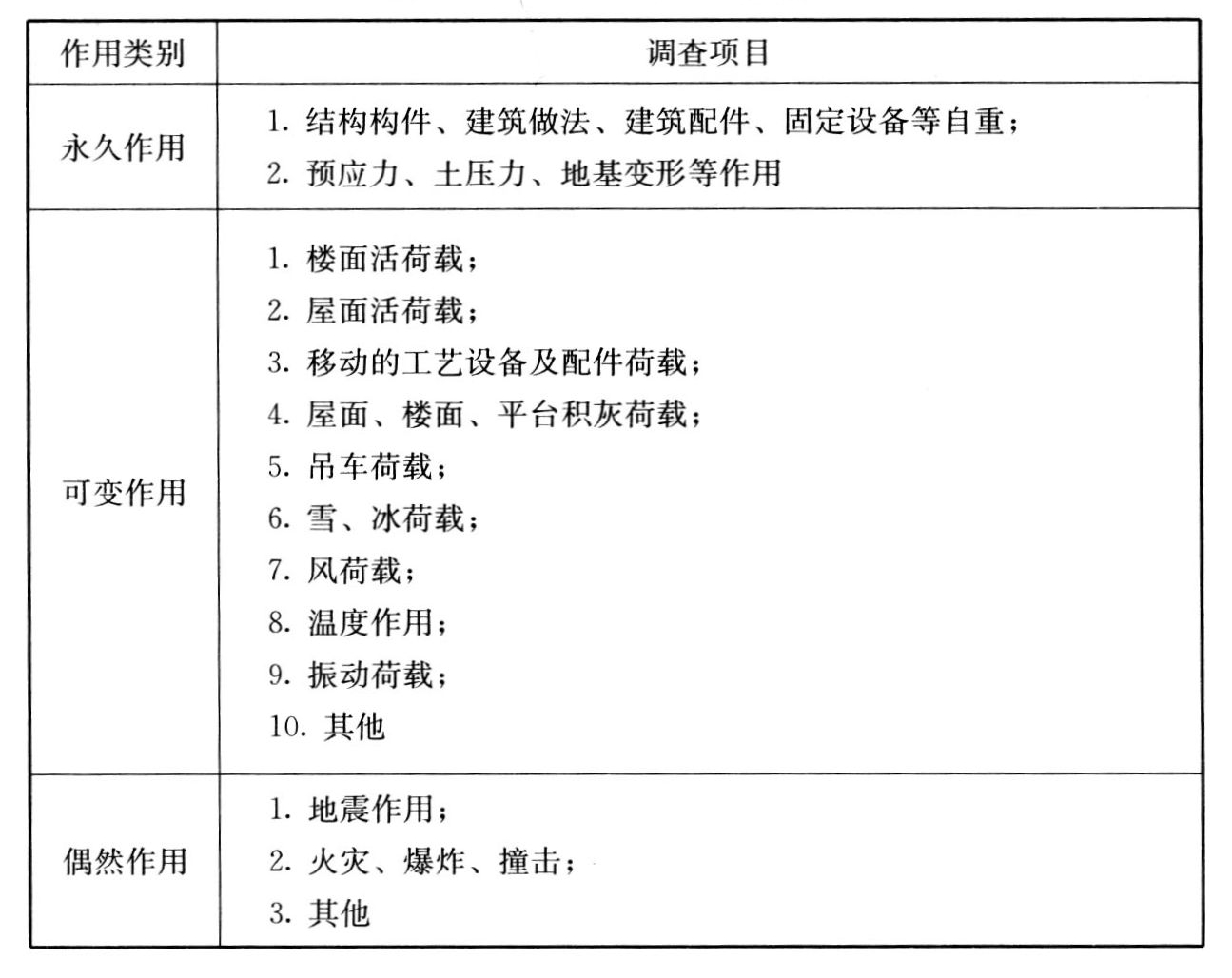 4.1.2 结构上作用的调查可选择表4.1.2中的相应项目。