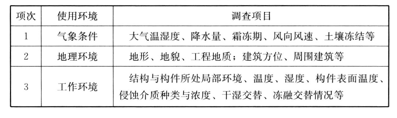 4.1.1 使用条件的调查和检测应包括结构上的作用、使用环境和使用历史的调查和检测,调查中应考虑使用条件在目标使用年限内可能发生的变化。