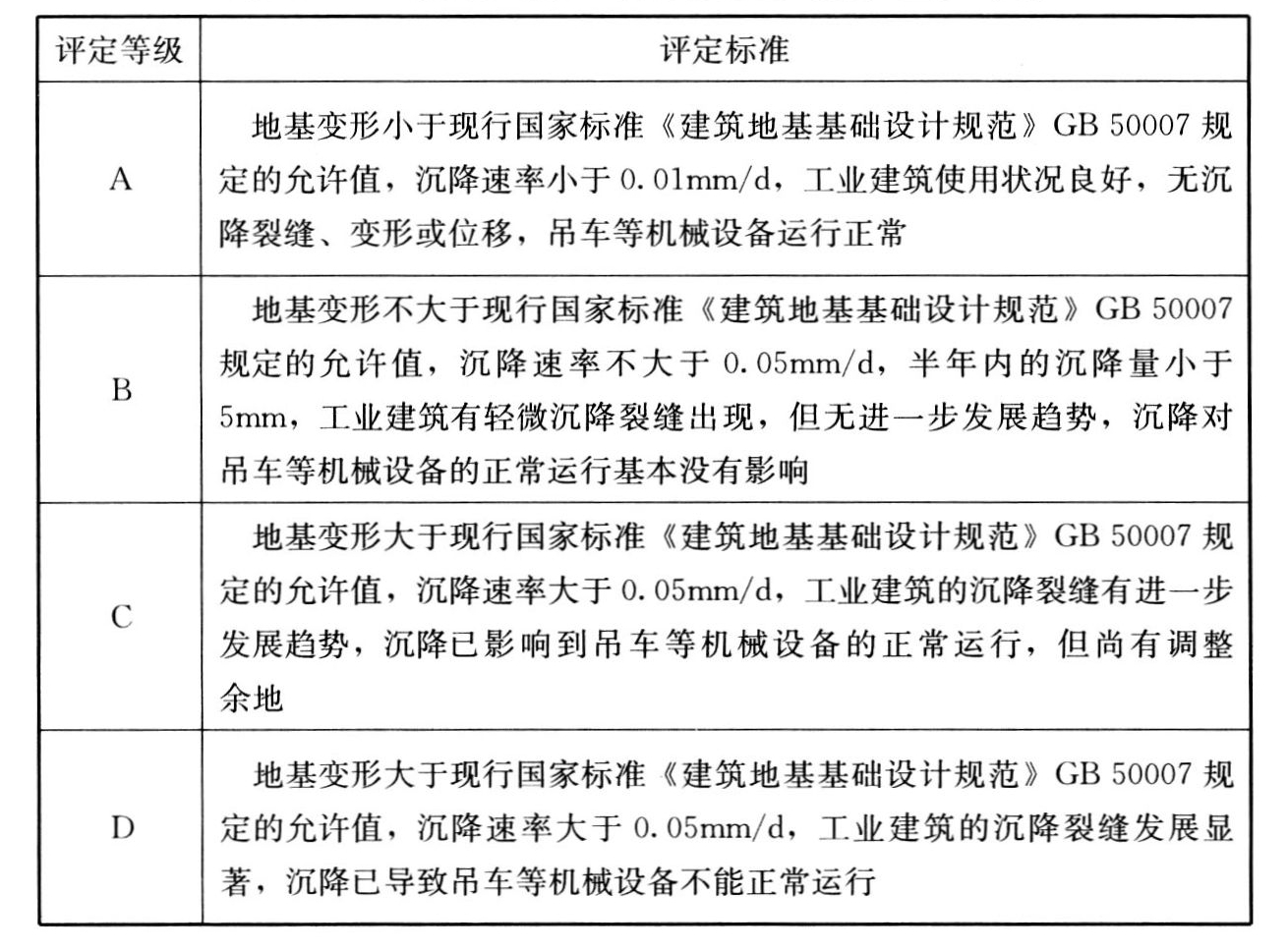 7.2.2 当地基基础的安全性按地基变形观测资料和工业建筑现状的检测结果评定时,应按表7.2.2的规定评定等级。