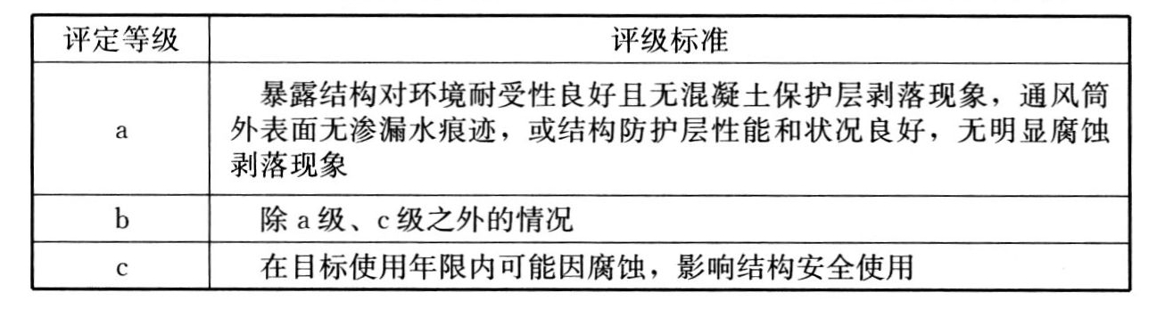 9.3.4 通风筒及支承结构、水槽及淋水构架结构的安全性等级应按承载能力项目的评定等级确定;使用性等级应按损伤、裂缝和倾斜三个项目的最低评定等级确定;可靠性等级可按安全性等级和使用性等级中的较低等级确定。