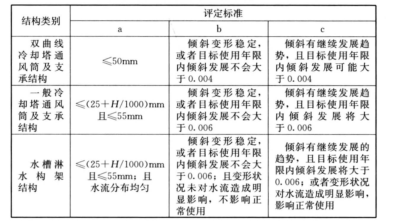 9.3.10 钢筋混凝土冷却塔鉴定单元的可靠性鉴定评级,应按地基基础、通风筒及支承结构的最低评定等级确定;当水槽及淋水构架的评定等级低于地基基础、通风筒较低等级两级及以上时,冷却塔鉴定单元的可靠性等级可按地基基础、通风筒较低等级降低一级确定。