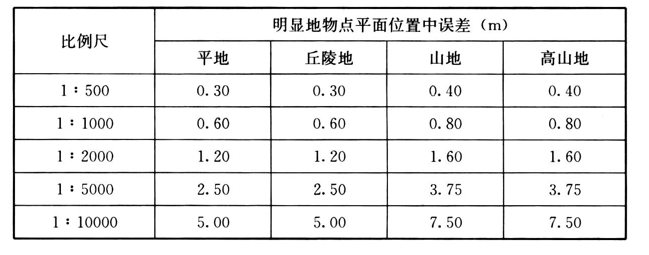 2 平面精度应采用明显地物点相对于邻近控制点的平面位置中误差衡量,不应大于表4.2.1-3的规定;对隐蔽和其他施测困难地区,不应大于表4.2.1-3规定值的1.5倍。