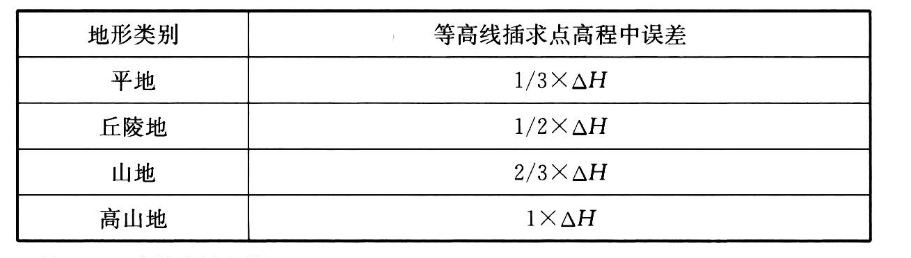 2)等高线插求点高程中误差不应大于表4.2.1-4的规定;对隐蔽和其他施测困难地区,不应大于表4.2.1-4规定值的1.5倍。