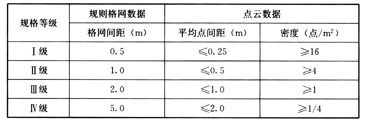 1 模型应采用规则格网数据或点云数据的形式表达,其规格等级应符合表4.2.3-1的规定。