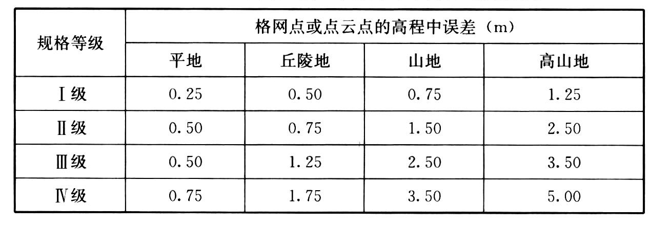 2 模型精度应采用格网点或点云点相对于邻近控制点的高程中误差衡量。高程中误差不应大于表4.2.3-2的规定;对隐蔽和其他施测困难地区,不应大于表4.2.3-2规定值的1.5倍。