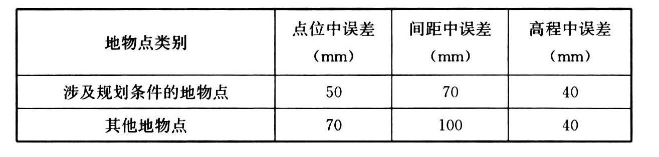 1 地物点相对于邻近控制点的点位中误差、地物点之间的间距中误差和高程中误差不应大于表5.2.5的规定。