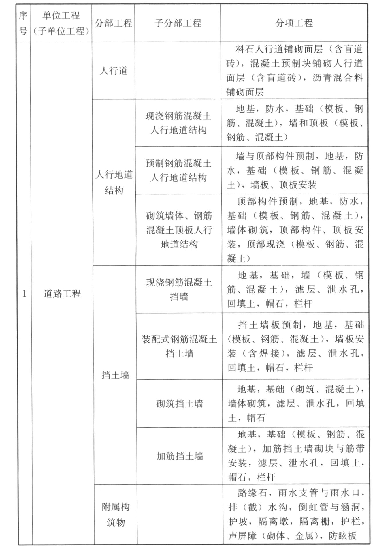 表C.0.1 市政工程的单位工程、分部工程、分项工程划分