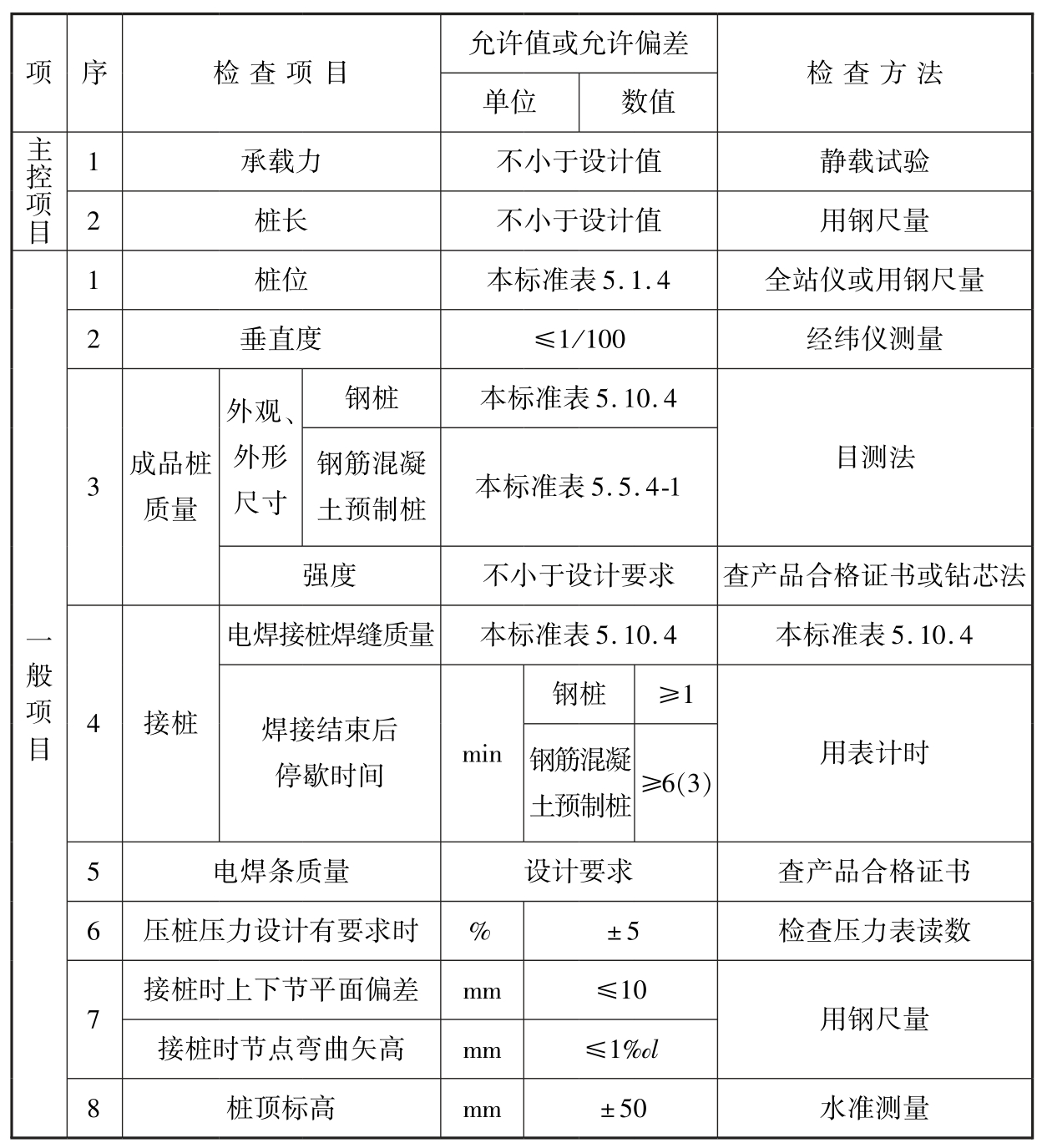5.11.2 压桩施工中应检查压力、桩垂直度、接桩间歇时间、桩的连接质量及压入深度。重要工程应对电焊接桩的接头进行探伤检查。对承受反力的结构应加强观测。