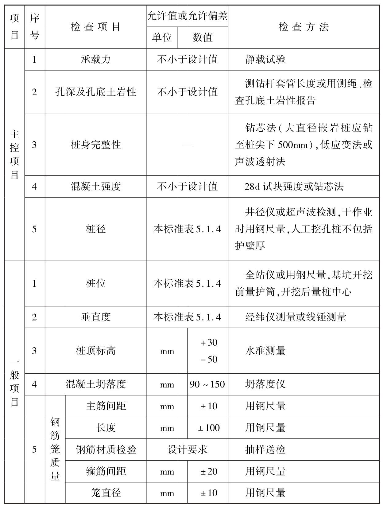 5.7.2 施工中应检验钢筋笼质量、混凝土坍落度、桩位、孔深、桩顶标高等。