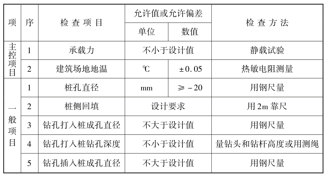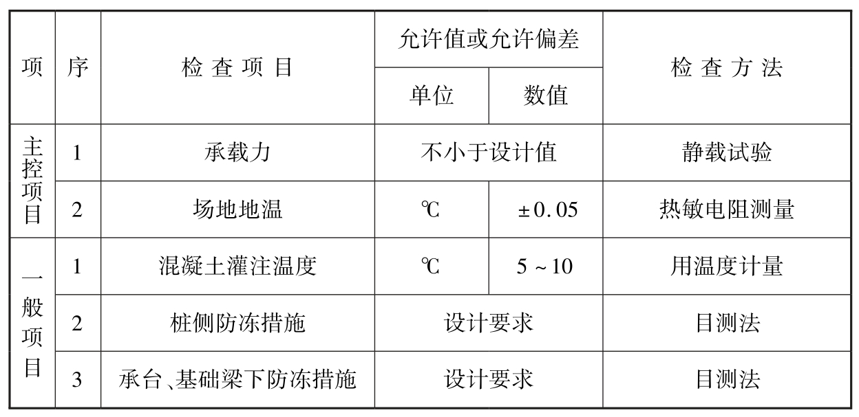1)施工中应检查桩身混凝土灌注温度及负温混凝土防冻剂、早强剂掺量;应检查在多年冻土融化层内的桩周外侧和低桩承台或基础梁下防止基土冻胀作用的措施,并应符合设计要求;