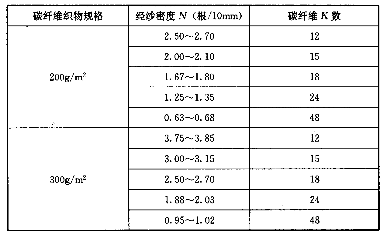 1 按表M.0.6给出的经纱密度与碳纤维纱线纤度(K数)对照表,判定所检测碳纤维织物的K数。