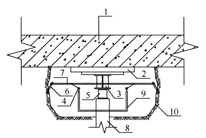 1—既有建筑基础;2—钢垫板;3—反力梁;4—百分表;5—千斤顶;