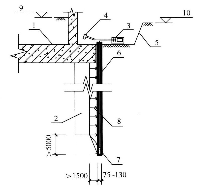 6—测管;7—检波器;8—透射波;9—室内地坪;10—室外地坪