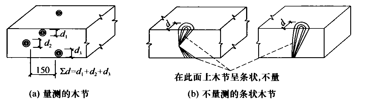 B.0.2 木节尺寸应按垂直于构件长度方向测量,并应取沿构件长度方向150mm范围内所有木节尺寸的总和(图B.0.2a)。直径小于10mm的木节应不计,所测面上呈条状的木节应不量(图B.0.2b)。