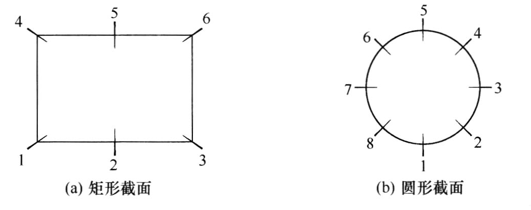 2 当采用应力波检测法检测构件断面时,应确保每个传感器间连接良好,传感器应均匀分布(图B.0.2),相邻传感器间距不应大于100mm;木构件直径或宽度不小于300mm时,传感器布置数量不宜少于10个;