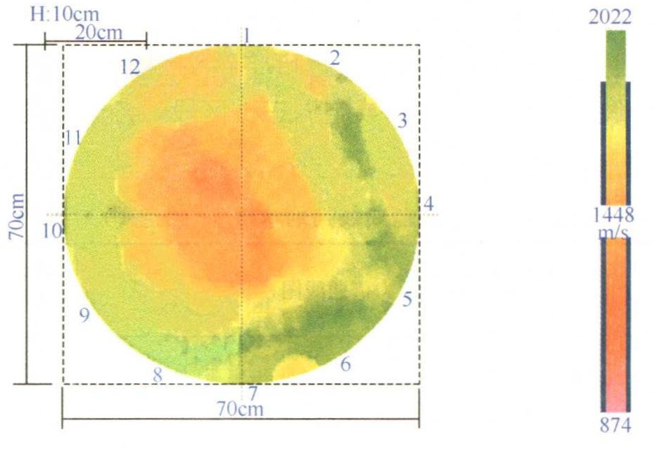 2 当采用应力波扫描仪获得木构件测定断面的彩色图像时,图像的颜色应直观显示木构件的健康状况,并且图像颜色的分布应由波速值大小决定,颜色由紫红色过渡到绿色表示波速由低值逐渐增大至高值(图B.0.4)。