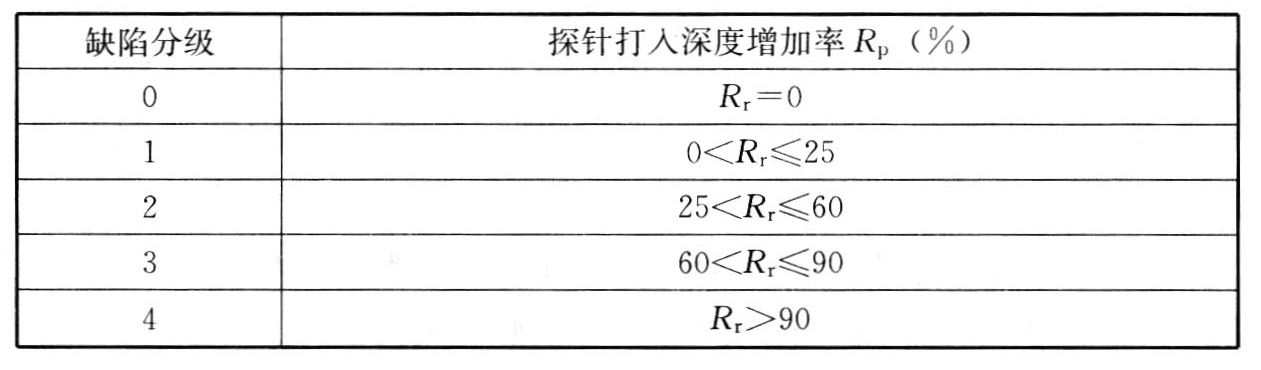 6.3.5 探针检测法可用于表层0~40mm范围的木材内部腐朽检测,同一木构件在腐朽和未腐朽部位应分别进行探针检测,且检测方向应相同,同一部位应设置不少于3个检测点。腐朽程度的探针检测分级应按表6.3.5的规定执行。