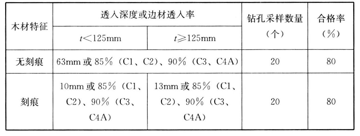 7.2.5 锯材、方木或原木构件防护剂透入度检测应符合表7.2.5的规定。