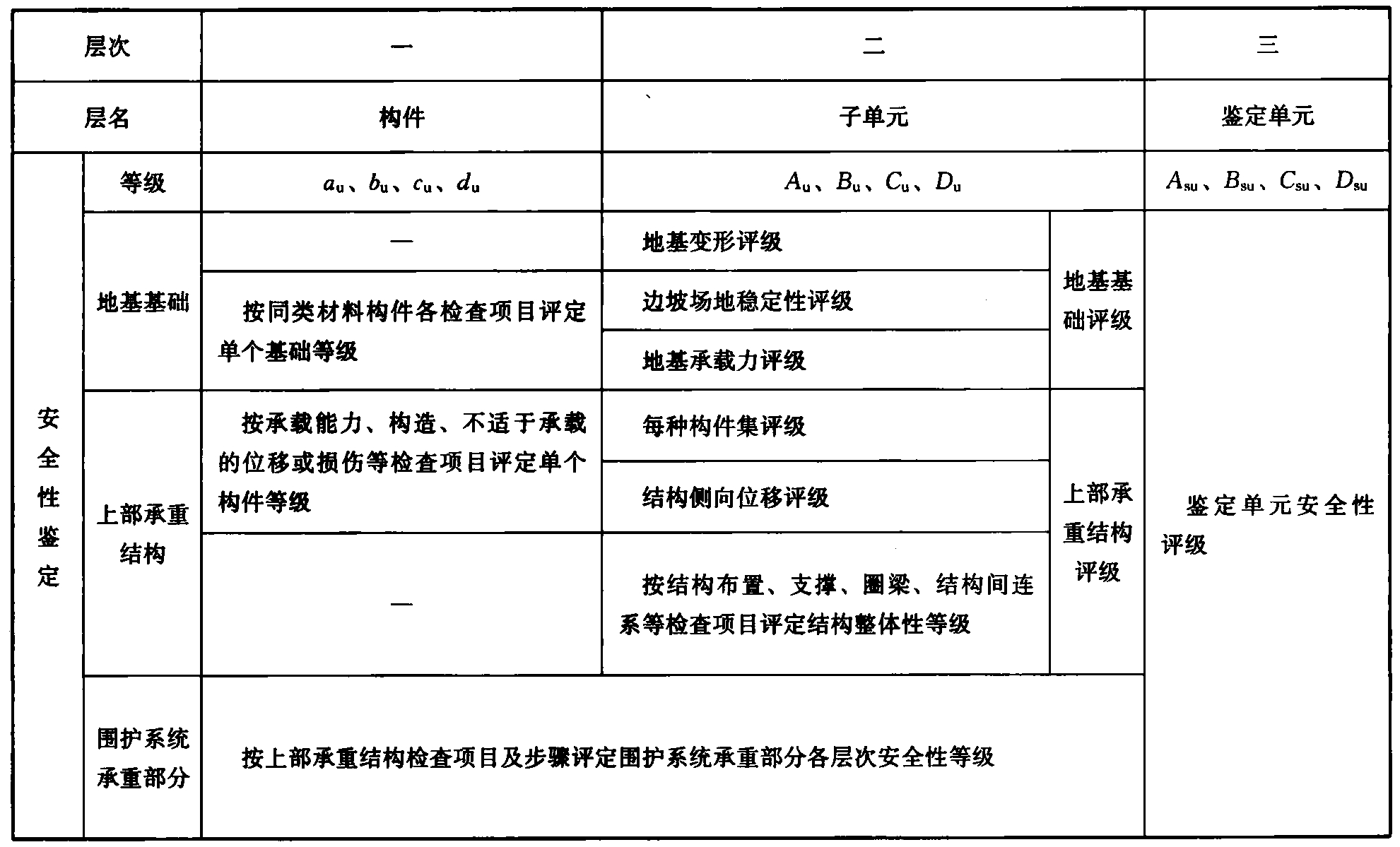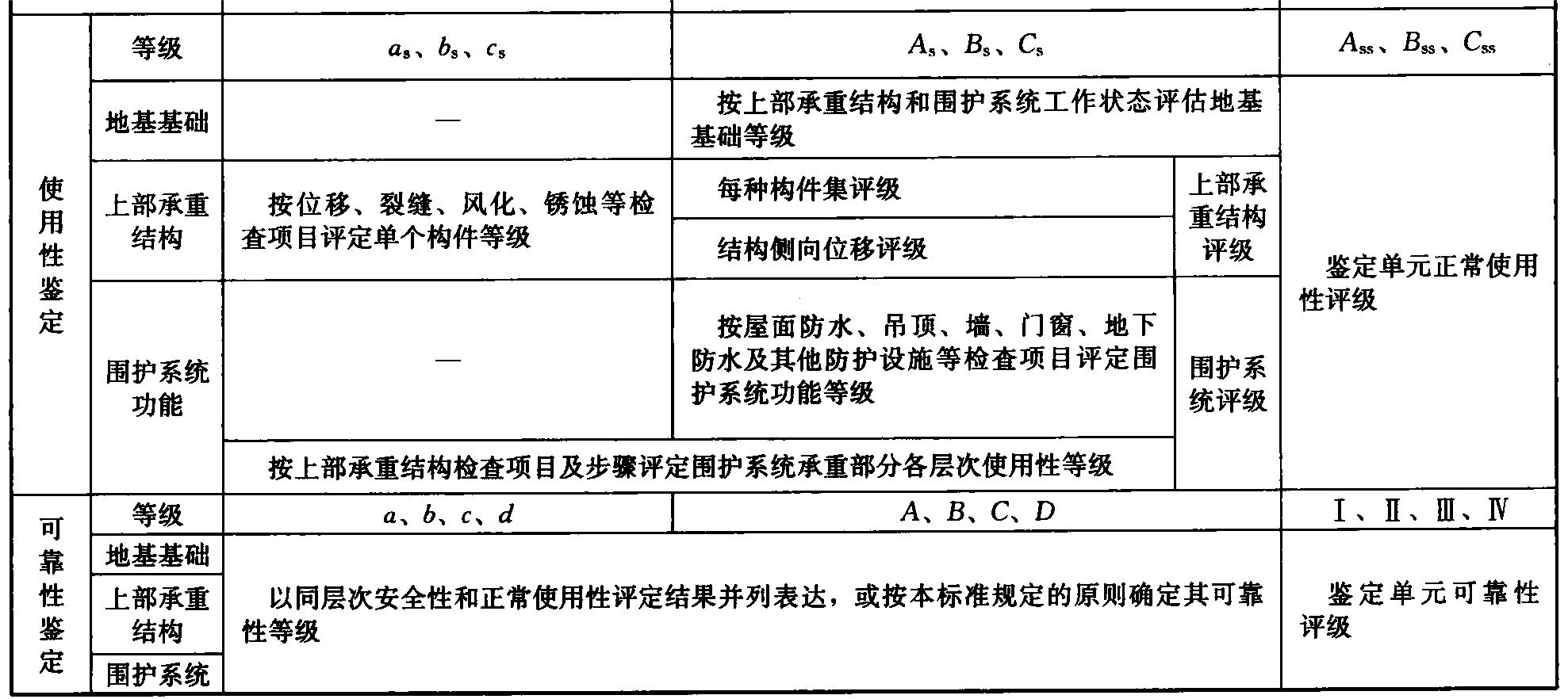 1 安全性和正常使用性的鉴定评级,应按构件、子单元和鉴定单元各分三个层次。每一层次分为四个安全性等级和三个使用性等级,并应按表3.2.5规定的检查项目和步骤,从第一层构件开始,逐层进行,并应符合下列规定: