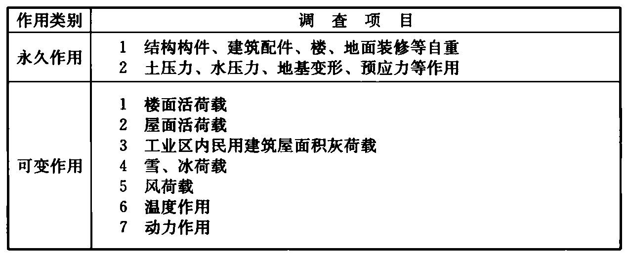 4.2.2 结构上作用的调查项目,可根据建筑物的具体情况以及鉴定的内容和要求,按表4.2.2选择。