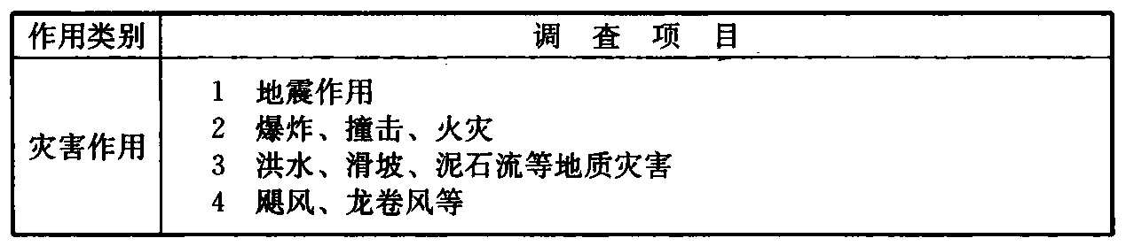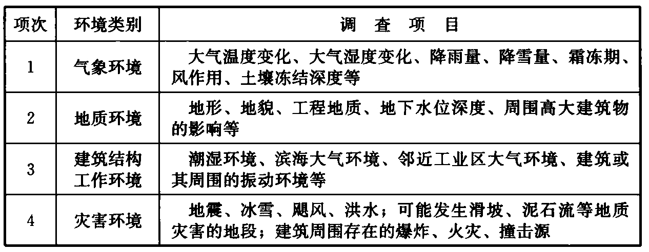 4.2.4 建筑物的使用环境应包括周围的气象环境、地质环境、结构工作环境和灾害环境,可按表4.2.4进行调查。
