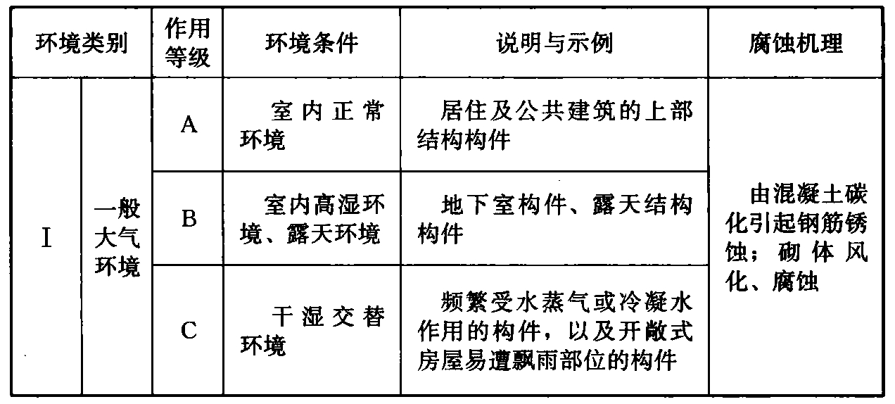 表4.2.5 民用建筑环境类别、环境条件和作用等级