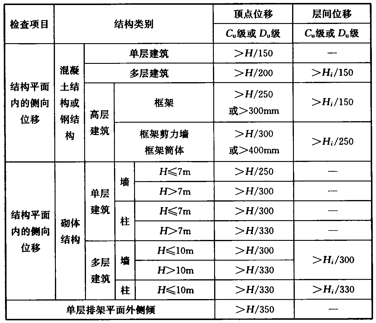 3 对某些构造复杂的砌体结构,当按本条第2款规定进行计算分析有困难时,各类结构不适于承载的侧向位移等级的评定可直接按表7.3.10规定的界限值评级。
