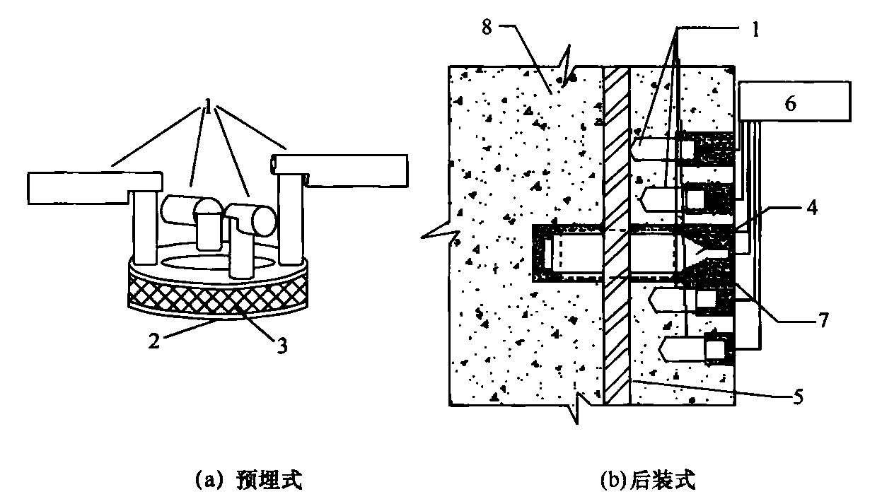 1—阳极;2—基座;3—钛金属网;4—阴极;5—钢筋;6—集线节点;7—密实填充物;8—混凝土