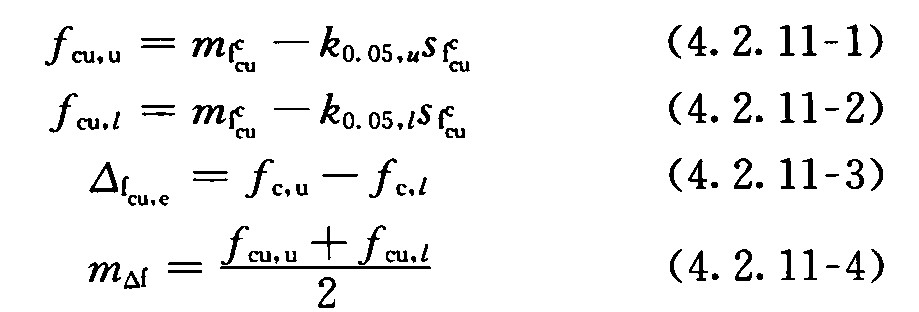 4.2.11 批量检测混凝土抗压强度时,检验批混凝土抗压强度推定区间上限值、下限值、上限与下限差值及其均值应按下列公式计算: