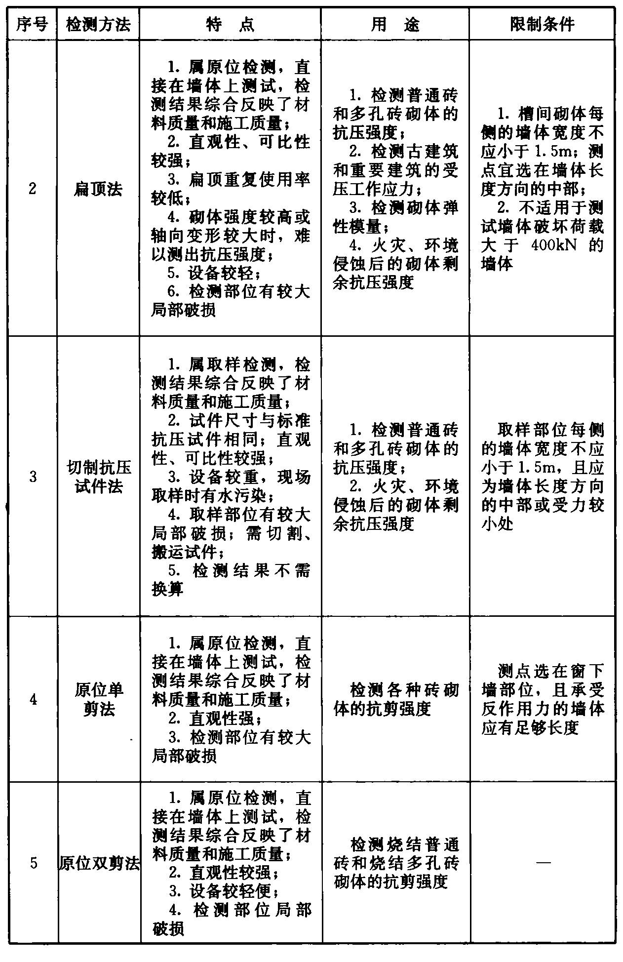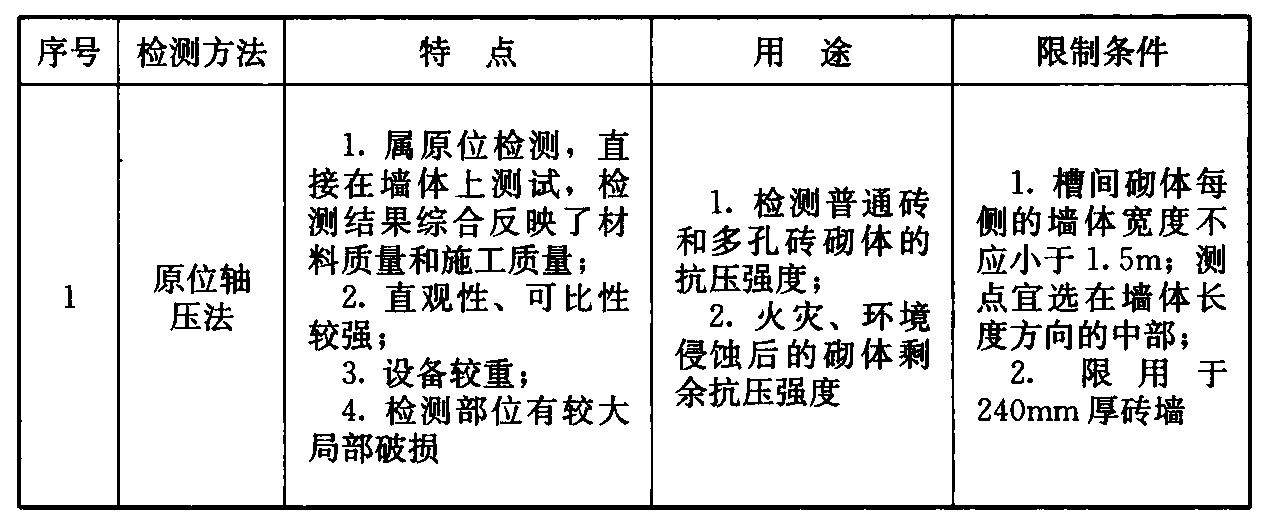 1 检测砌体抗压强度可采用原位轴压法、扁顶法、切制抗压试件法。