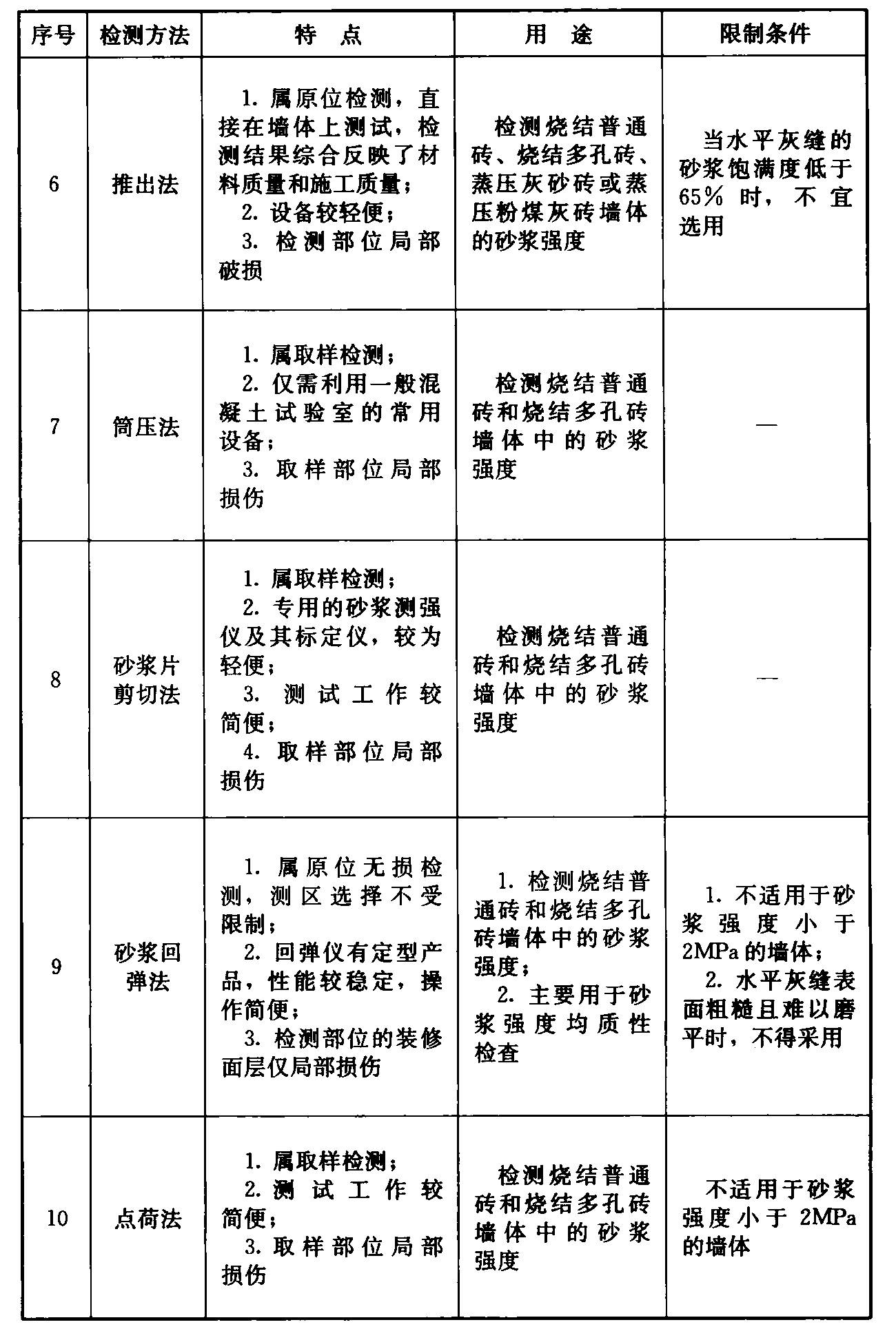 4 检测砌筑砂浆强度可采用推出法、筒压法、砂浆片剪切法、砂浆回弹法、点荷法、砂浆片局压法。