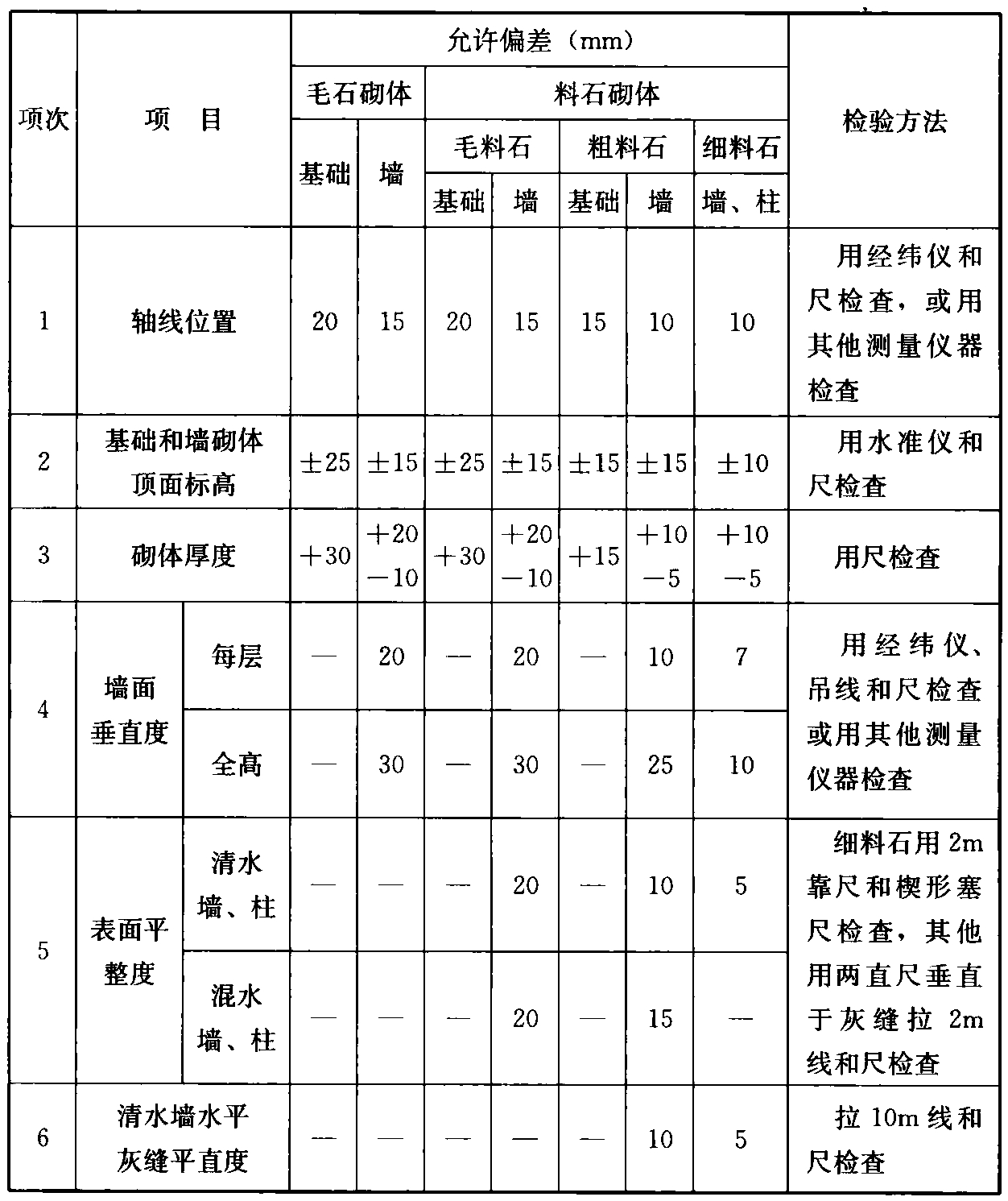 7.3.1 石砌体尺寸、位置的允许偏差及检验方法应符合表7. 3. 1的规定。