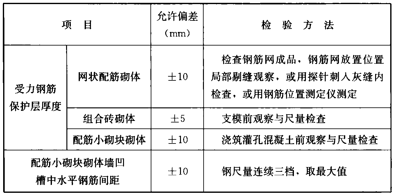 检验方法:通过钢筋网成品检查钢筋规格,钢筋网放置间距采用局部剔缝观察,或用探针刺入灰缝内检查,或用钢筋位置测定仪测定。