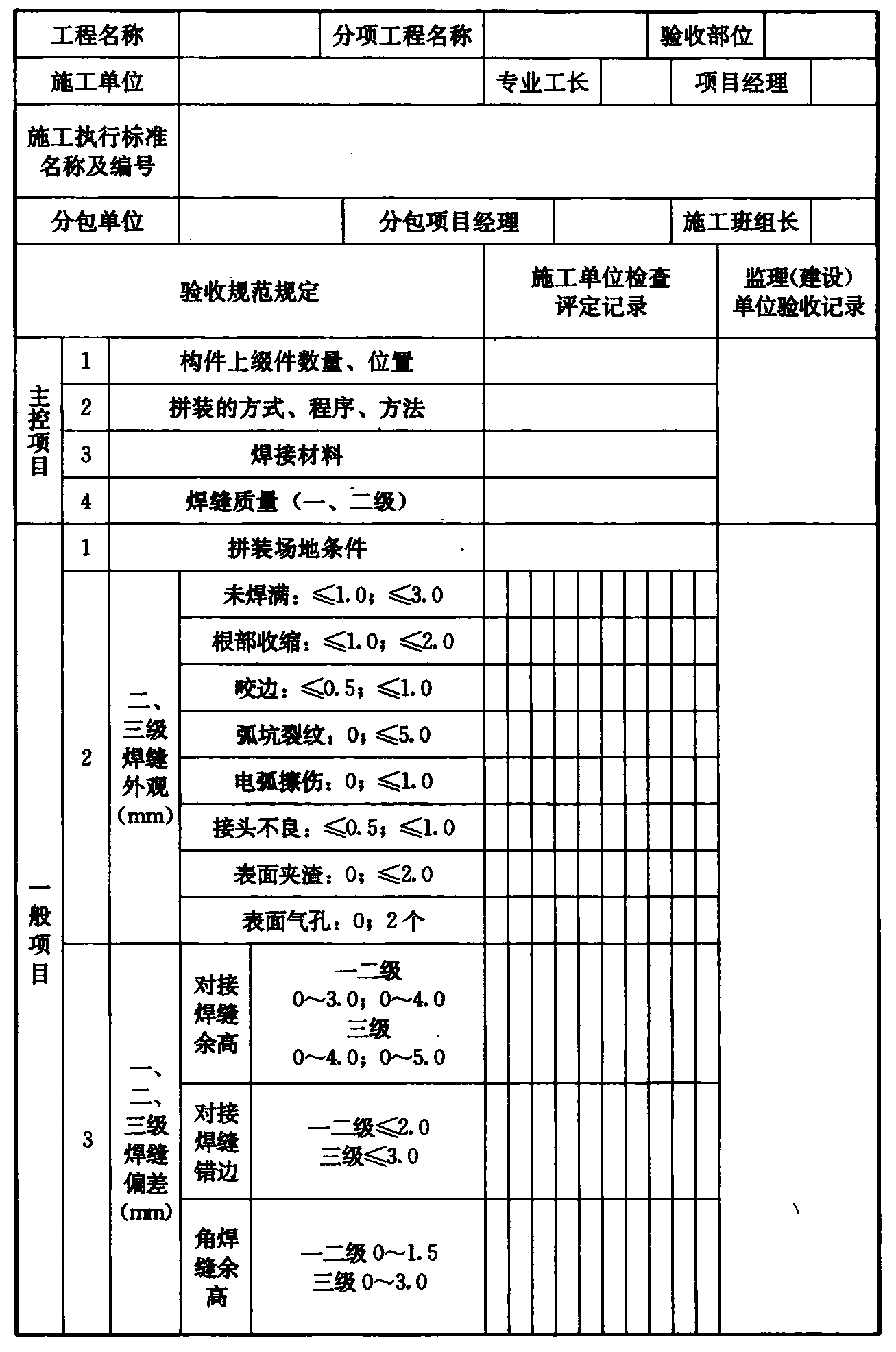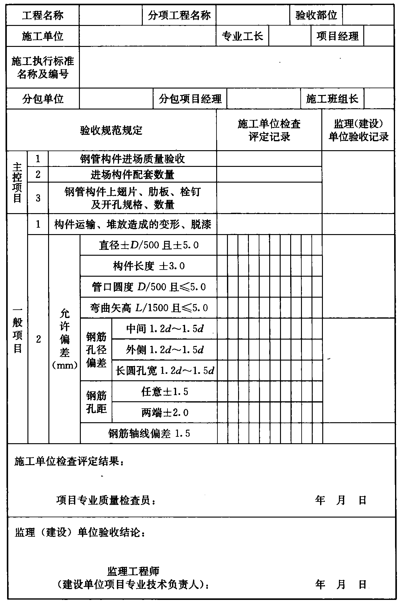A.0.2 钢管混凝土构件现场拼装检验批质量验收记录应符合表A.0.2的规定。