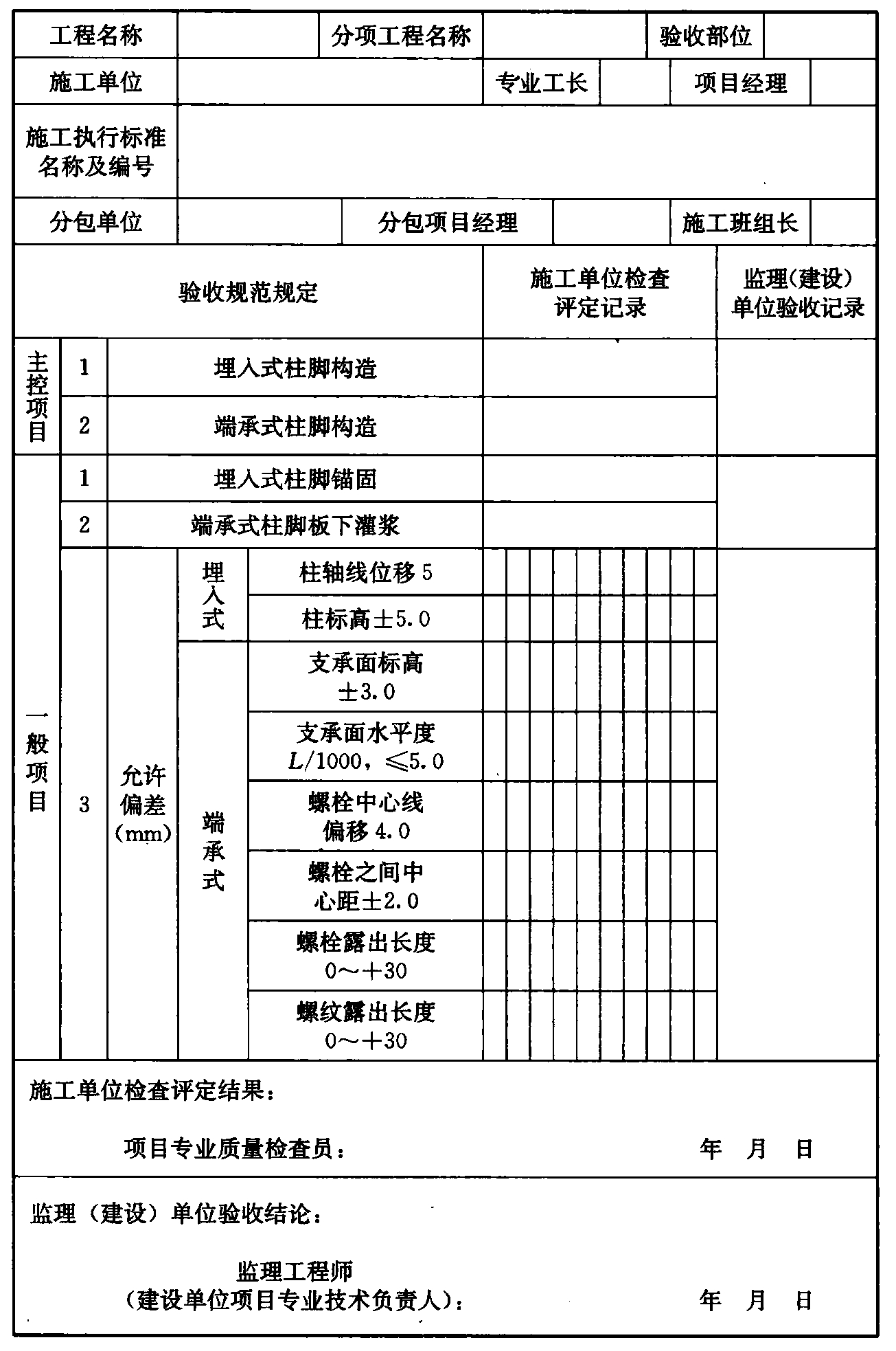 A.0.3 钢管混凝土柱柱脚锚固检验批质量验收记录应符合表A.0.3的规定。