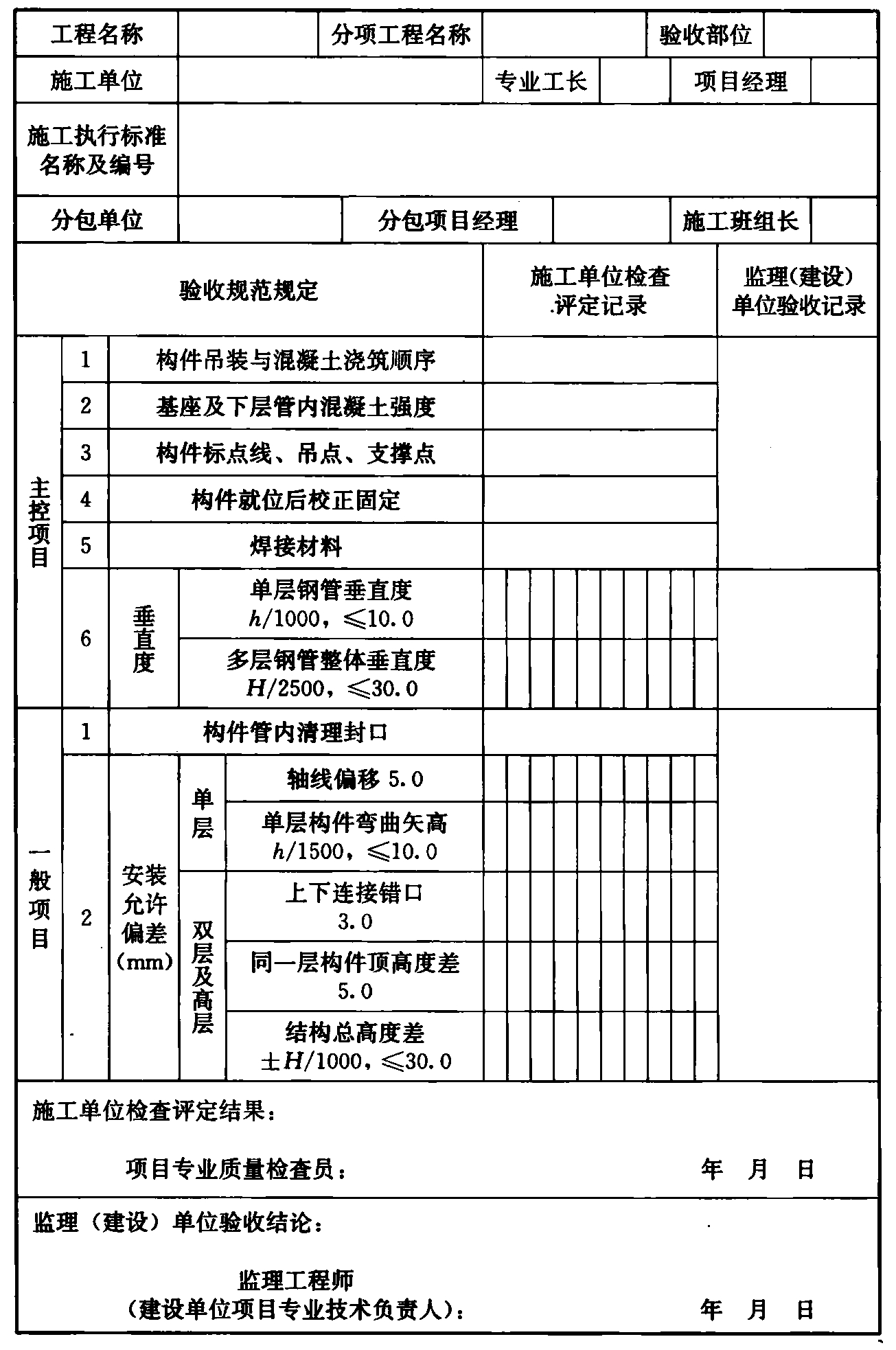 表A.0.4 钢管混凝土构件安装检验批质量验收记录