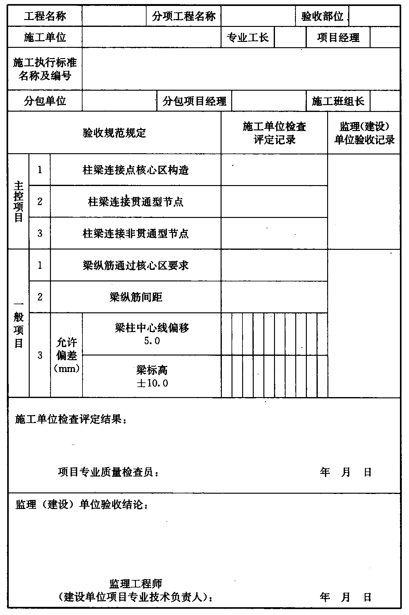 表A.0.5 钢管混凝土柱与钢筋混凝土梁连接检验批质量验收记录