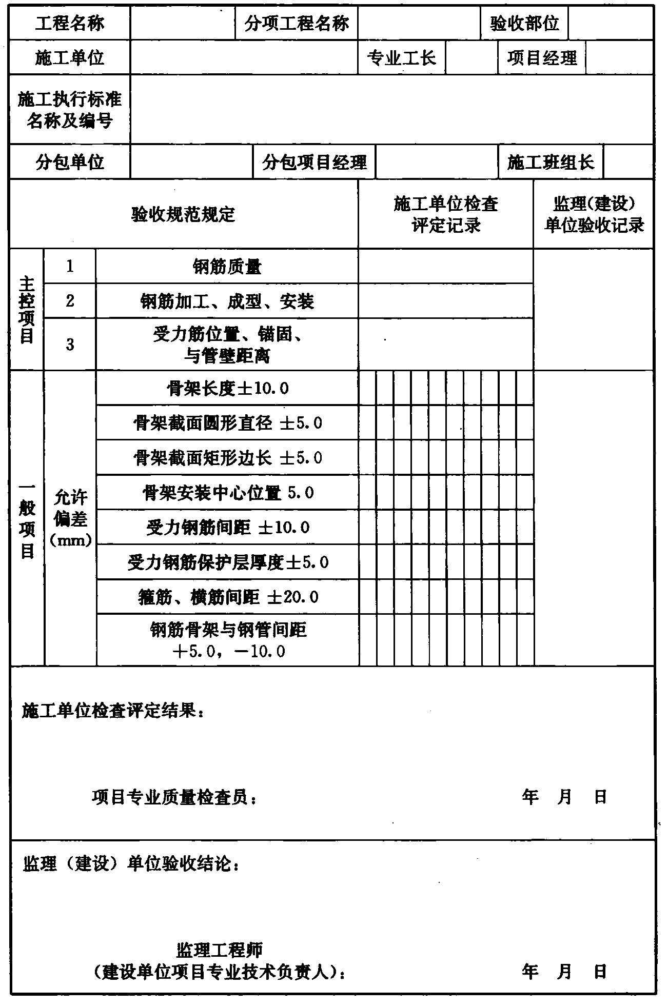 A.0.6 钢管内钢筋骨架检验批质量验收记录应符合表A.0.6的规定。