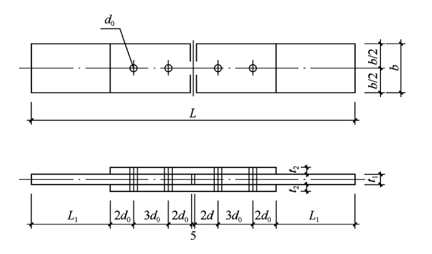 2 抗滑移系数试验应采用双摩擦面的二栓拼接的拉力试件(图B.0.7)。试件与所代表的钢结构构件应为同一材质、同批制作、采用同一摩擦面处理工艺和具有相同的表面状态(含有涂层),在同一环境条件下存放,并应用同批同一性能等级的高强度螺栓连接副。
