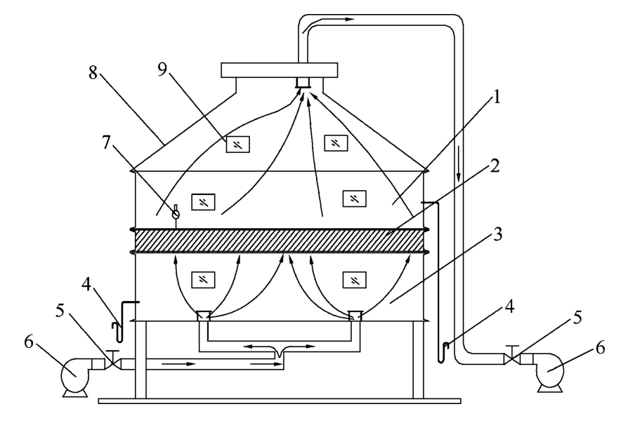 1—上部压力箱;2—试件及安装框架;3—下部压力箱;4—压力测量装置;