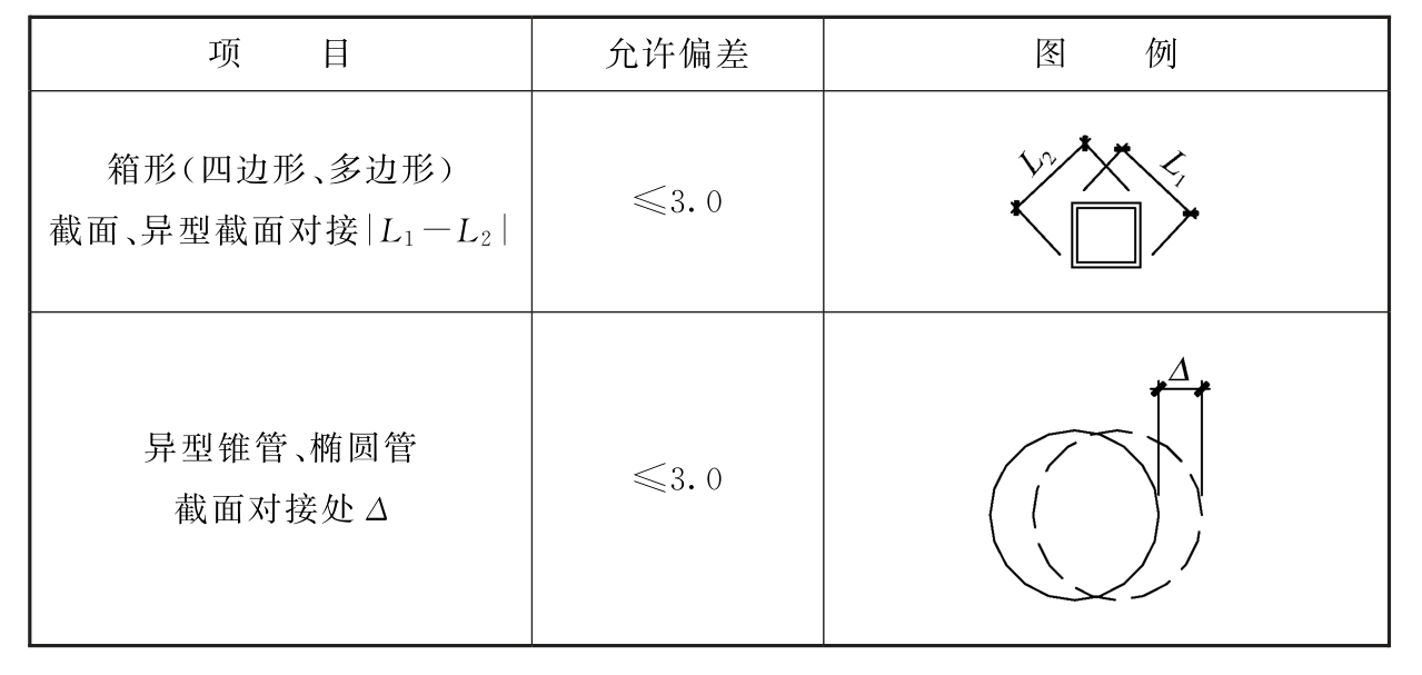 10.5.5 构件对接处截面的平面度偏差:截面边长l≤3m时,偏差不应大于2mm;截面边长l>3m时,允许偏差不应大于l/1500。