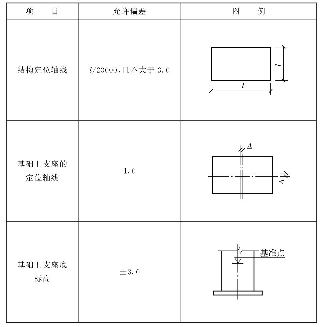 表11.2.1 定位轴线、基础上支座的定位轴线和标高的允许偏差(mm)