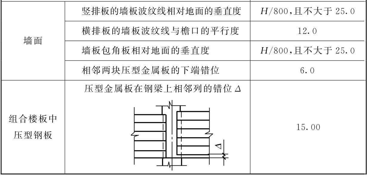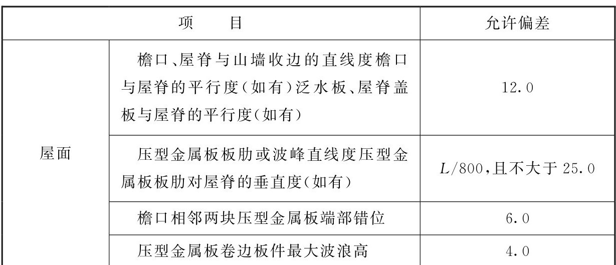 12.3.11 压型金属板、泛水板、包角板和屋脊盖板安装的允许偏差应符合表12.3.11的规定。