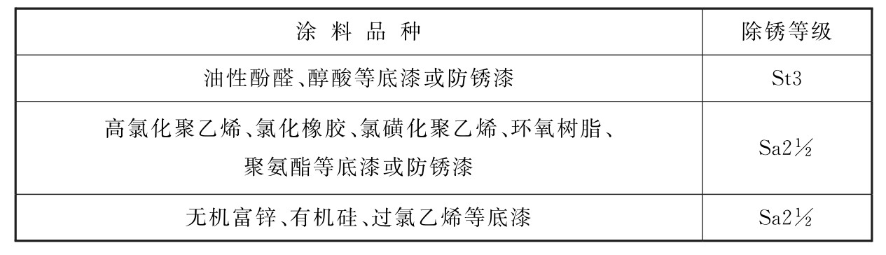 13.2.1 涂装前钢材表面除锈等级应满足设计要求并符合国家现行标准的规定。处理后的钢材表面不应有焊渣、焊疤、灰尘、油污、水和毛刺等。当设计无要求时,钢材表面除锈等级应符合表13.2.1的规定。