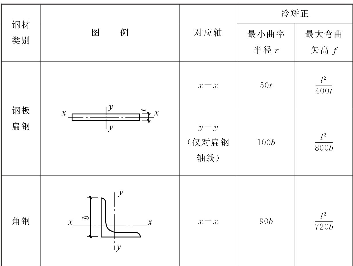 表7.3.4 冷矫正的最小曲率半径和最大弯曲矢高(mm)