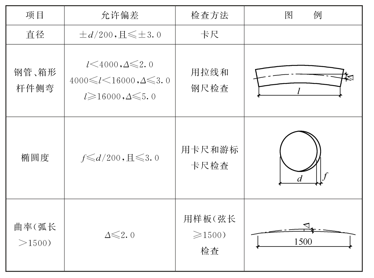 表7.3.7 钢管弯曲成型和矫正后的允许偏差(mm)