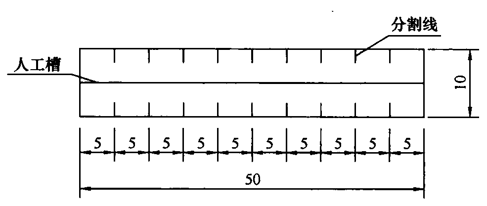 5.2.11 当磁粉检测中使用A型灵敏度试片有困难时,可用与A型材质和灵敏度相同的C型灵敏度试片代替。C型灵敏度试片厚度应为50μm,人工槽深度应为15μm,其几何尺寸应符合图5.2.11的规定。