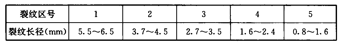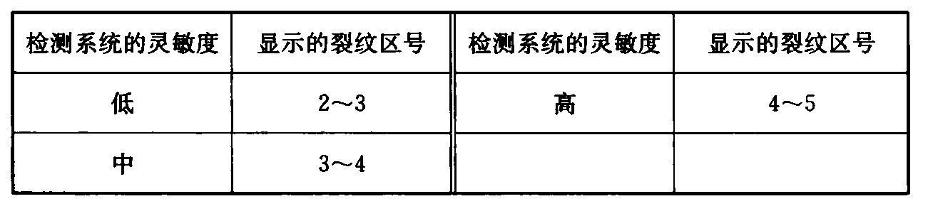 1 当采用不同灵敏度的渗透检测剂系统进行渗透检测时,不锈钢镀铬试块(B型灵敏度试块)上可显示的裂纹区号应符合表6.2.5-1的规定;