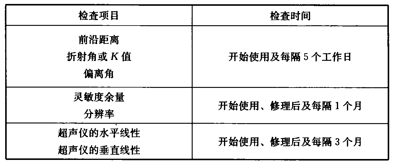 7.2.2 超声仪、探头及系统性能的检查应按现行行业标准《无损检测 A型脉冲反射式超声检测系统工作性能测试方法》JB/T9214规定的方法测试,其周期检查项目及时间应符合表7.2.2的规定。