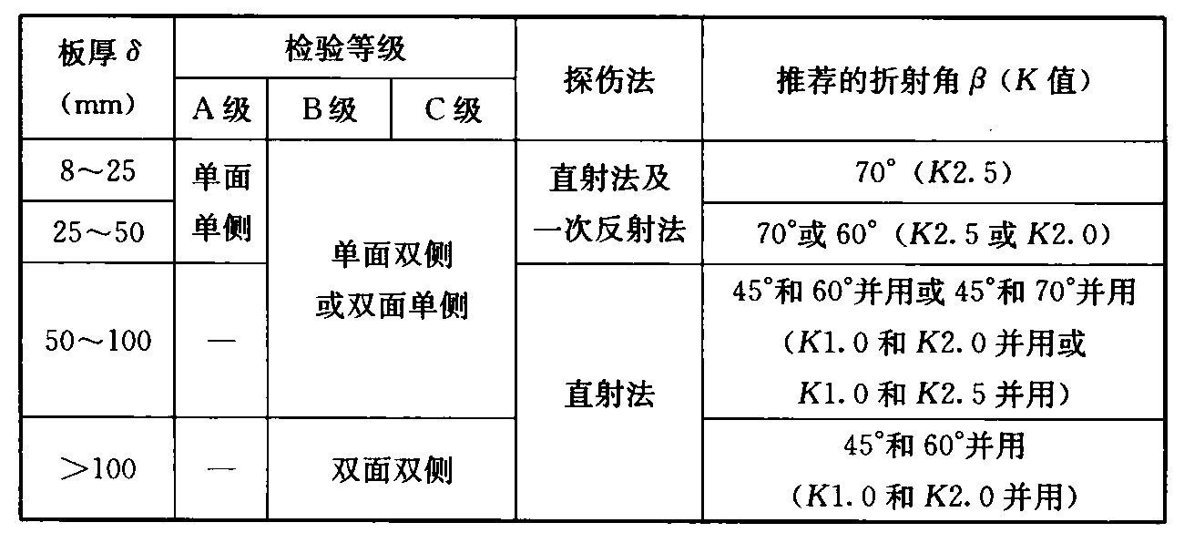 4 探伤面与斜探头的折射角β(或K值)应根据材料厚度、焊缝坡口形式等因素选择,检测不同板厚所用探头角度宜按表7.2.3采用。